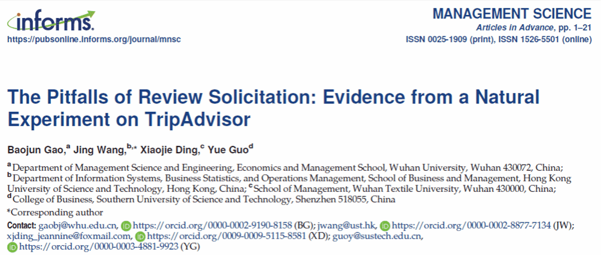 7 | 丁校洁 | The Pitfalls of Review Solicitation: Evidence from a Natural Experiment on TripAdvisor https://doi.org/10.1287/mnsc.2023.01006 | Management Science, UTD24、FT50之一 |