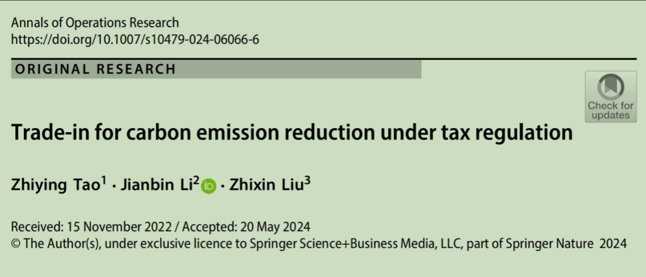 4 | 陶智颖 | Trade-in for carbon emission reduction under tax regulation DOI:10.1007/s10479-024-06006-6 | Annals of Operations Research,JCR分区Q1 |