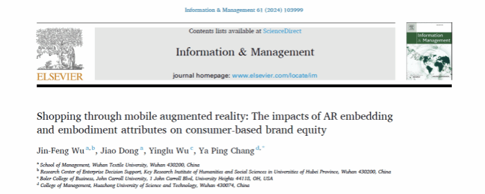 9 | 吴锦峰 | Shopping through mobile augmented reality: The impacts of AR embedding and embodiment attributes on consumer-based brand equity https://doi.org/10.1016/j.im.2024.103999 | Information & Management,JCR 1区,ABS,3星 |