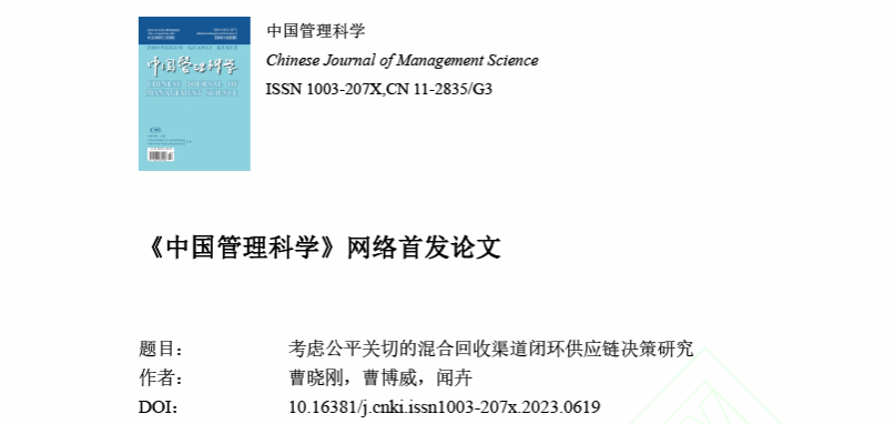 5 | 曹晓刚 | 考虑公平关切的混合回收渠道闭环供应链决策研究 10.16381/j.cnki.issn1003-207x.2023.0619 | 中国管理科学,国自委管理科学A级,FMS T1 |