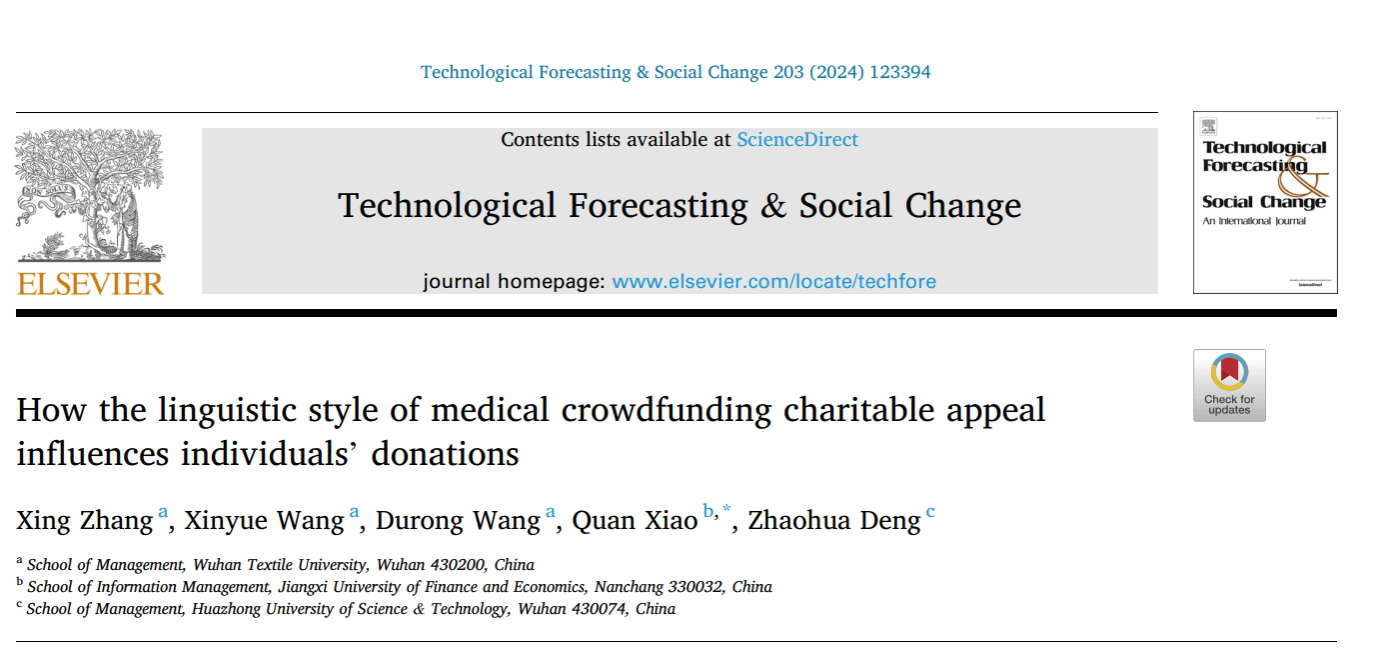 2 | 张星 | How the linguistic style of medical crowdfunding charitable appeal influences individuals’ donations https://doi.org/10.1016/j.techfore.2024.123394 | Technological Forecasting & Social Change,中科院1区,ABS,3星 |