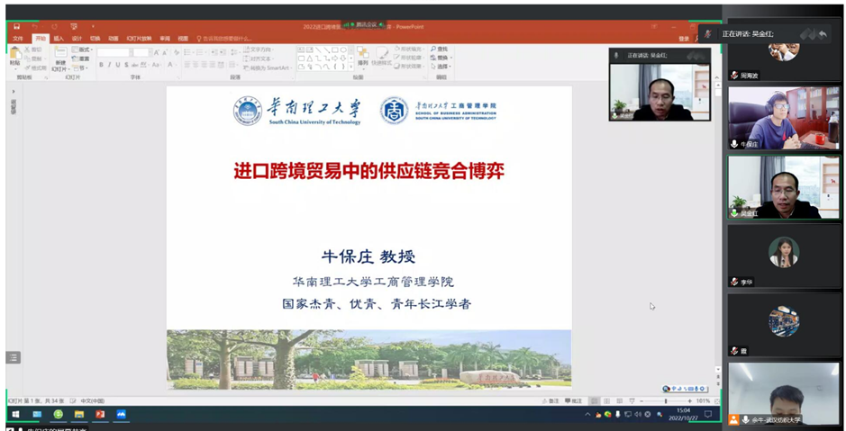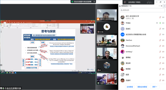 近日,应yl9193永利邀请,华南理工大学工商yl9193永利牛保庄教授为我院师生带来了一场精彩的线上学术讲座,讲座题目为“进口跨境贸易中的供应链竞合博弈”。本次讲座由yl9193永利余牛教授主持,吴金红院长出席并致辞,我院相关领域教师与研究生积极参与讨论。