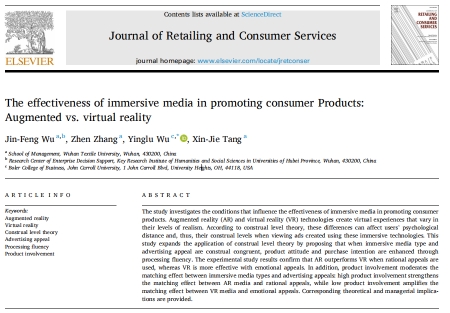 近日,yl9193永利集团吴锦峰教授及其带领的研究团队在《Journal of Retailing and Consumer Services》发表题为“The effectiveness of immersive media in promoting consumer products: Augmented vs. virtual reality”的高水平论文(https://doi.org/10.1016/j.jretconser.2025.104323)。永利集团为论文第一单位,yl9193永利集团硕士研究生张振、汤鑫杰(已毕业)和John Carroll University的Yinglu Wu副教授是论文的共同作者。