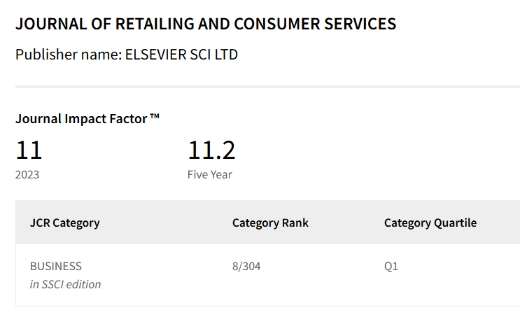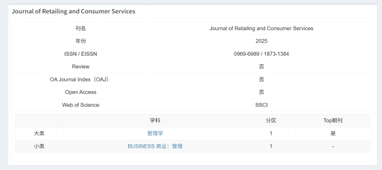 《Journal of Retailing and Consumer Services》是专注于零售和服务研究的国际权威学术期刊,SSCI JCR Q1;中科院2025年分区1。