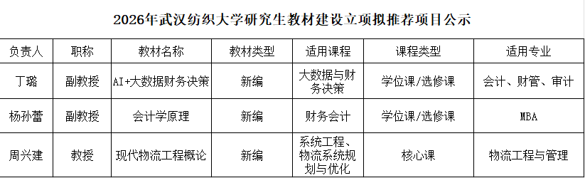根据学校《关于开展2026年研究生教材建设项目申报的通知》文件精神,经本人申报,学院教授委员会审议,现将2026年度研究生教材建设立项拟推荐项目公示如下(按姓氏拼音排序):