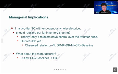 The two presentations in the second half of the morning were presided over by Professor Yu Niu, director of the Department of Logistics Management of the School of Management. Dr. Huang Rihuan from the Chinese University of Hong Kong (Shenzhen) made an achievement report entitled Retail Inventory Sharing in Two Tier Supply Chains:.
