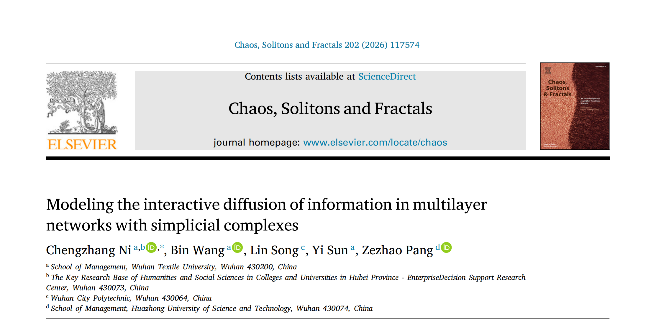 近日,交叉学科国际权威期刊《Chaos, Solitons and Fractals》发表了yl9193永利集团倪成章副教授为第一作者和通讯作者的研究论文《Modeling the interactive diffusion of information in multilayer networks with simplicial complexes》。yl9193永利集团为该论文的第一单位,yl9193永利集团孙昳副教授、硕士研究生王彬是论文的共同作者。