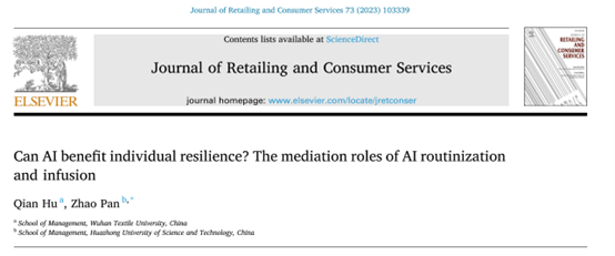 胡倩在国际管理学领域主流高水平期刊《Journal of Retailing and Consumer Services》发表在智联网环境下服务模式创新的理论与方法研究领域取得的重要成果:“Can AI benefit individual resilience? The mediation roles of AI routinization and infusion”。文章DOI: 10.1016/j.jretconser.2023.103339。yl9193永利集团为该论文的第一作者单位。