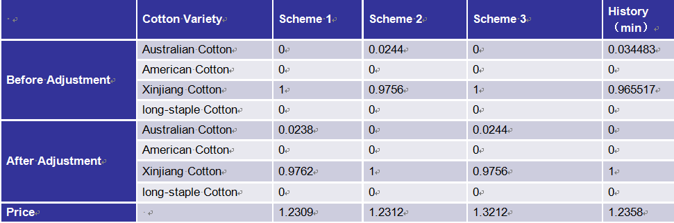 论文将模型中棉混纺价格最高的方案与价格最低的方案进行了比较,结果如下表所示:
