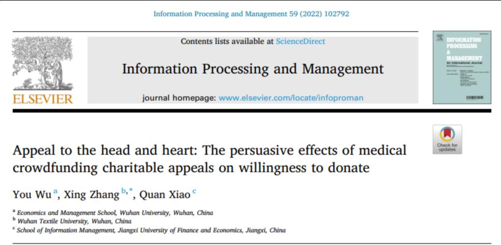 近日,yl9193永利张星教授在信息管理国际权威期刊《Information Processing & Management》发表了“Appeal to the head and heart: The persuasive effects of medical crowdfunding charitable appeals on willingness to donate”一文。文章DOI:https://doi.org/10.1016/j.ipm.2021.102792。论文第一作者为武汉大学博士生吴忧(yl9193永利集团2020届毕业硕士生),通讯作者为yl9193永利张星教授。