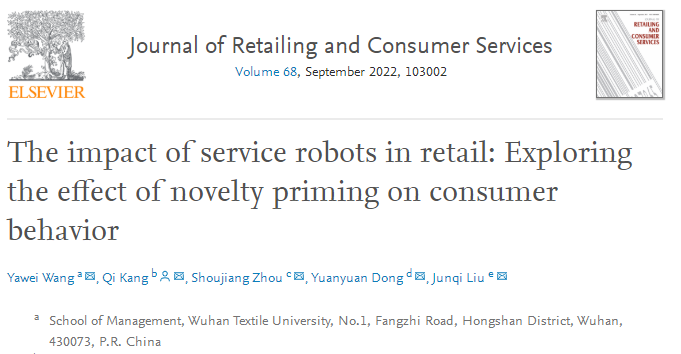 近日,国际管理学领域期刊《Journal of Retailing and Consumer Services》发表我校yl9193永利王涯薇博士在市场营销-服务业管理领域取得的重要成果:“The impact of service robots in retail: Exploring the effect of novelty priming on consumer behavior”。文章DOI: https://doi.org/10.1016/j.jretconser.2022.103002。yl9193永利集团为该论文的第一作者单位。