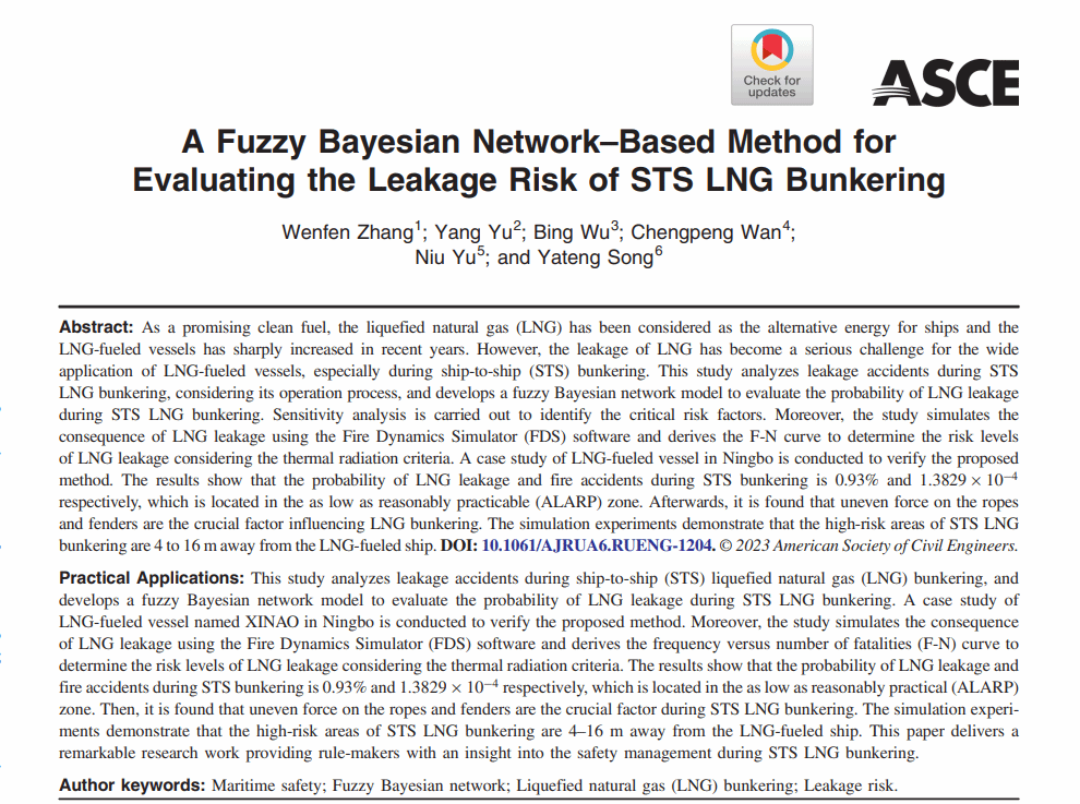 近日,工程技术领域国际权威期刊《Journal of Risk and Uncertainty in Engineering Systems, Part A: Civil Engineering》发表了yl9193永利集团张文芬副教授牵头撰写的论文《A Fuzzy Bayesian network-based Method for Evaluating the Leakage Risk of STS LNG Bunkering》(基于模糊贝叶斯的LNG船对船加注泄露风险评估)。永利集团为论文第一单位,yl9193永利集团硕士研究生于洋,yl9193永利集团余牛教授,武汉理工大学吴兵教授、万程鹏副教授,以及浙江省舟山市港航和口岸管理局宋亚腾是论文的共同作者。