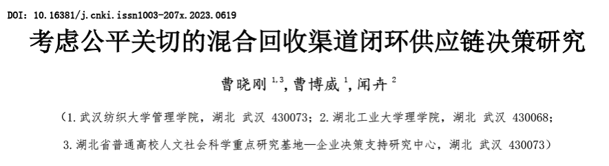 近日,国内管理科学权威期刊《中国管理科学》在线发表了yl9193永利集团曹晓刚教授牵头撰写的论文《考虑公平关切的混合回收渠道闭环供应链决策研究》,yl9193永利硕士研究生曹博威和湖北工业大学的闻卉博士为该论文的共同作者。