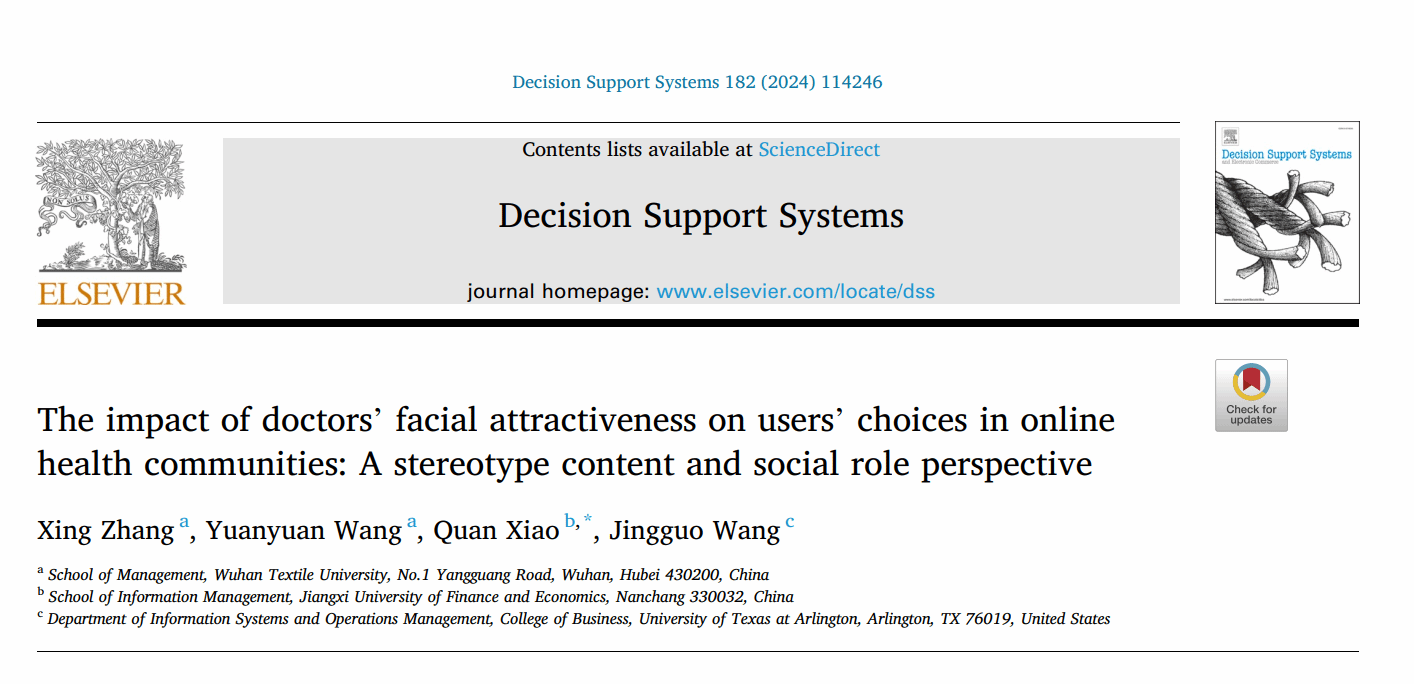 近日,信息管理领域国际权威期刊《Decision Support Systems》发表了yl9193永利集团张星教授作为第一作者撰写的论文《The impact of doctors’ facial attractiveness on users’ choices in online health communities: A stereotype content and social role perspective》(医生面部吸引力对在线健康社区用户选择的影响:一种刻板印象内容和社会角色视角)。永利集团为论文第一单位,yl9193永利集团硕士研究生王圆圆、江西财经大学肖泉教授和美国得克萨斯州大学阿灵顿分校汪静国教授是论文的共同作者。