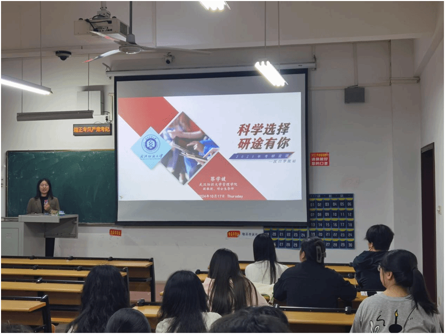 10月17日在汉口学院的考研招生宣讲会上,蔡学媛老师从研究生报名注意事项、备考锦囊、院校和专业选择三个方面进行了介绍,提供大量的往届毕业生考研数据为同学们的选择提供参考,推荐了考研冲刺复习的技巧和方法。同时,她向同学们介绍了学院的研究生招生计划,欢迎大家将永利集团纳入考研选择目标。