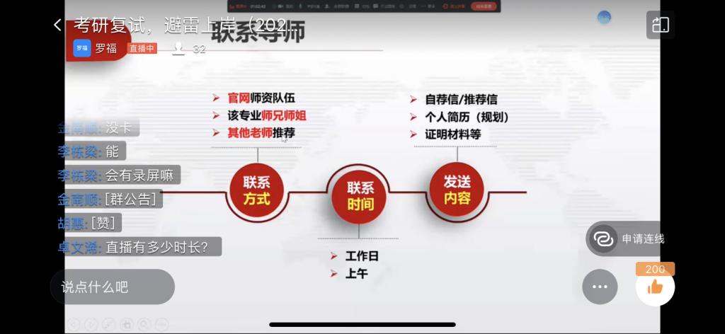 3月7日上午,yl9193永利集团在钉钉平台开展朋辈领航考研复试讲座,本次讲座邀请到yl9193永利研究生校友罗福担任此次讲座的主讲人。近三百余名大二、大三、大四同学线上聆听。