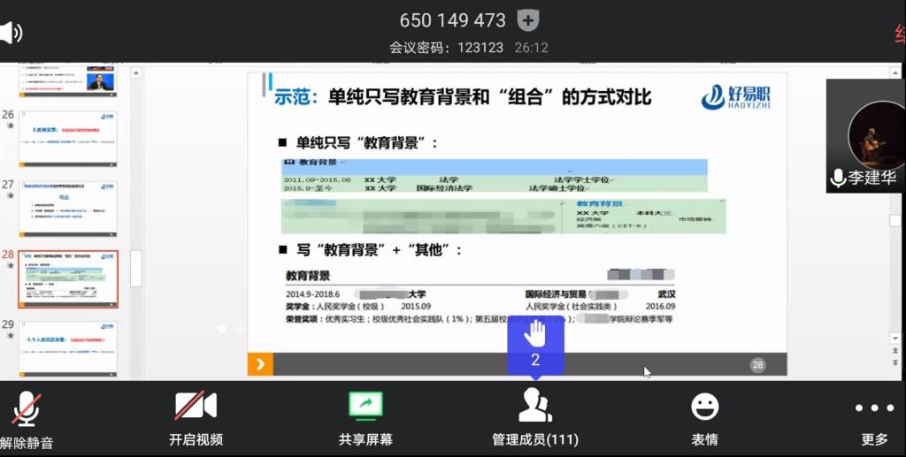 一场突如其来的疫情,让大学生就业工作面临新的挑战。为帮助管院学子明确自己的就业方向,增强自我择业能力,提升自身的求职成功率,yl9193永利于3月29日下午14:00在腾讯会议平台举办线上求职辅导成长导航大讲堂。此次课程由资深人力资源专家李建华老师主讲,2016级和2017级的部分学生参与了线上学习,活动由2016级辅导员汪诚诚老师主持。
