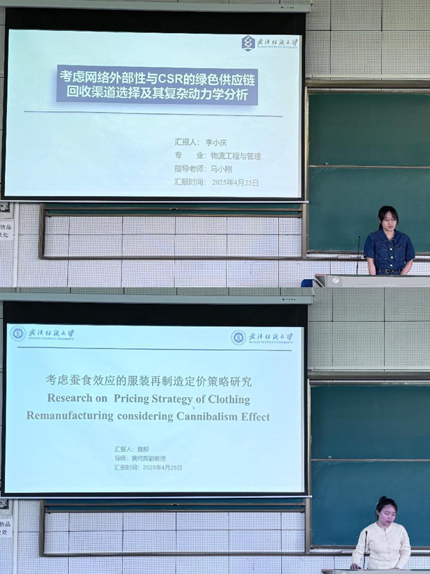 分会场7-531教室,首先李小庆同学汇报了论文《考虑网络外部性与CSR的绿色供应链回收渠道选择及其复杂动力学分析》,探讨了网络外部性和企业社会责任(CSR)对绿色供应链回收渠道选择的影响。随后,魏柳同学聚焦于《考虑蚕食效应的服装再制造定价策略研究》,分析了再制造服装对新服装的蚕食效应及其对定价策略的影响。