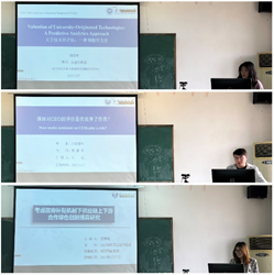 在会场二中,首先分享的是来自20级物流的邢汶渊同学介绍自己题为《基于数据挖掘预测的机器人储位分配策略研究》,在网购蓬勃发展的背景下,基于数据挖掘方法对历史订单数据进行深入分析,通过研究商品的共同购买情况,计算并探讨产品间的关联性,确定商品之间的关联规则,构建预测模型对历史订单进行数据预测分析,根据货物存储规则构建机器人场景下以拣选时间最短为目标的储位分配模型,设计启发式算法进行求解。随后是来自20级物流的方梦圆同学,汇报主题为《智能配送机器人特征对顾客持续使用意愿的影响研究——基于顾客契合视角》,介绍了基于顾客契合的理论框架,引入智能配送机器人特征、顾客契合、持续使用意愿和健康意识等变量,从消费者的角度出发,构建了顾客契合视角下的智能配送机器人的持续使用意愿影响因素模型。来自21级工商的王杜荣同学,介绍了《How question type influences knowledge withholding in social Q&A community》论文,该论文基于社会交换理论,以问题难度和用户匿名性为边界条件,研究不同类型的问题如何影响知识保留,进行了两个实验来检验假设。第4位分享者是来自21级管科的刘添叶同学,在他的论文《Valuation of University-Originated Technologies: A Predictive Analytics Approach》中本文提出了一个随机森林方法来评估大学发明的技术,整合了货币价值和专利价值的技术评估模型。第5位是来自21级管科的王斌同学,论述题目为《媒体对CEO的评价是否发挥了作用?》,论文借鉴了其他学科的媒体情绪概念,基于资源基础观和社会信息加工理论,利用3415家中国上市公司CEO的199,230份媒体报道数据,探讨了媒体对CEO的积极情绪是否以及如何对公司财务绩效做出贡献。最后一位是21级物流的王培瑶同学,汇报主题为《考虑政府补贴机制下供应链上下游合作绿色创新的演化博弈研究》,研究内容为在考虑消费者异质性的基础上,从现有绿色创新补贴方式的背景出发,选取政府与供应链内部相结合的补贴模式,构建政府、供应商和制造商三方演化博弈模型,讨论分析三方在不同情形下的最优决策及稳定性条件。