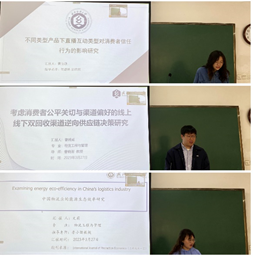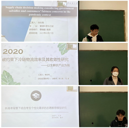 在会场一中,首先分享的是来自20级的冯帅同学,介绍了《新高考背景下结合考生个性化需求的志愿推荐模型研究》的相关内容,在新高考实施背景下,针对高考生出现了报考难的问题,论文提出一种智能审核的高考志愿推荐模型对考生初始的高考志愿表进行分析与评估,筛选出不合理的志愿并指出问题所在从而警示考生,最后通过实例来验证该模型,结果表明该模型能够有效提高考生的志愿填报质量。随后是来自20级物流的常芸玮同学,论述了题为《碳约束下冷链物流效率及其收敛性研究——以生鲜农产品为例》中利用三阶段数据包络分析模型对2012—2017年长江经济带生鲜农产品冷链物流效率进行测度,为提高长江经济带生鲜农产品冷链物流效率,提出加强低碳冷链物流基础设施建设、提升信息技术应用水平和加大区域对外开放程度等相关对策建议。然后是来自20级管科的徐兆榆同学,他介绍了论文《疫情环境下考虑政府补贴和消费者公平的供应链决策》,论文在疫情影响的背景下,构建了一个由政府-制造商-零售商组成的三阶段博弈模型。深入研究了消费者对供应链成员和社会利益的公平关注行为。第4位分享者是来自21级管科的黄佳敏同学,在他的论文《不同类型产品下直播互动类型对消费者信任行为的影响研究》中通过访谈法、实验法以及实证分析等方法,构建关于在不同类型产品下,电商主播的互动类型对于消费者信任行为的影响模型。第5位是来自21级物流曹博威同学,论述题目为《考虑消费者公平关切与渠道偏好的线上线下双回收渠道逆向供应链决策研究》,论文在新兴技术快速发展的背景下,考虑消费者公平关切与渠道偏好的基础上,根据Stackelberg博弈理论建立一个以处理商为主导者,回收商为追随者的线上线下双回收渠道逆向供应链模型,深度研究消费者两种行为偏好对供应链决策的影响。最后一位是21级物流的文莉同学,题目为《Examining energy eco-efficiency in China’s logistics industry》,采用投入产出指标法、投影寻踪回归法和神经网络法,对2010-2019年中国及各省区物流业的CO2排放特征进行了实证研究。