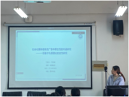 来自21级管理科学与工程专业的方亚琪同学介绍了论文《社会化媒体信息流广告中原生性的内涵研究——一项基于扎根理论的定性研究》,论文中摘要指明:为了应对广告被用户规避这一问题,社会化媒体中出现了随所处环境变化的“原生广告”。然而,现有研究甚少注意到该类广告与周围编辑环境的适配,或只是局限于形式这一方面。因此,本研究通过深度访谈获取数据、采用扎根理论分析方法,构建了“原生性”的概念和结构,以此探索应对与减少广告规避的有效模式。