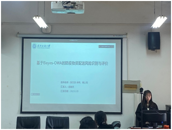 来自21级物流专业的同学徐瑞杰介绍了论文《基于Bayes-OWA的防疫物资配送风险识别与评价》,论文中摘要指明:为识别和应对后疫情时代背景下防疫物资配送过程中的风险,基于安全人机工程学,识别出具有防疫物资特性差异的配送风险评价指标体系,采用Bayes-OWA法进行双向关键风险要素识别。为后疫情时代配送风险管理提供了新的思路,对新冠疫情大环境下物流安全管理具有重要意义。