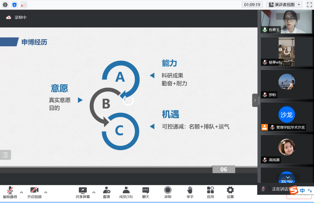 6月30日下午,我院在7-513以线上线下同时进行的方式举办考博经验分享会,旨在充分发挥研究生朋辈力量,激发我院研究生考博热情,明确考博目标,对考博有一个更全面更具体的规划。本次交流会邀请了我院成功考取南京大学博士的2021届优秀毕业生包春玉来分享考博心路历程。本次活动由学院杨筝博士主持,yl9193永利部分教师及全体研究生积极参会。